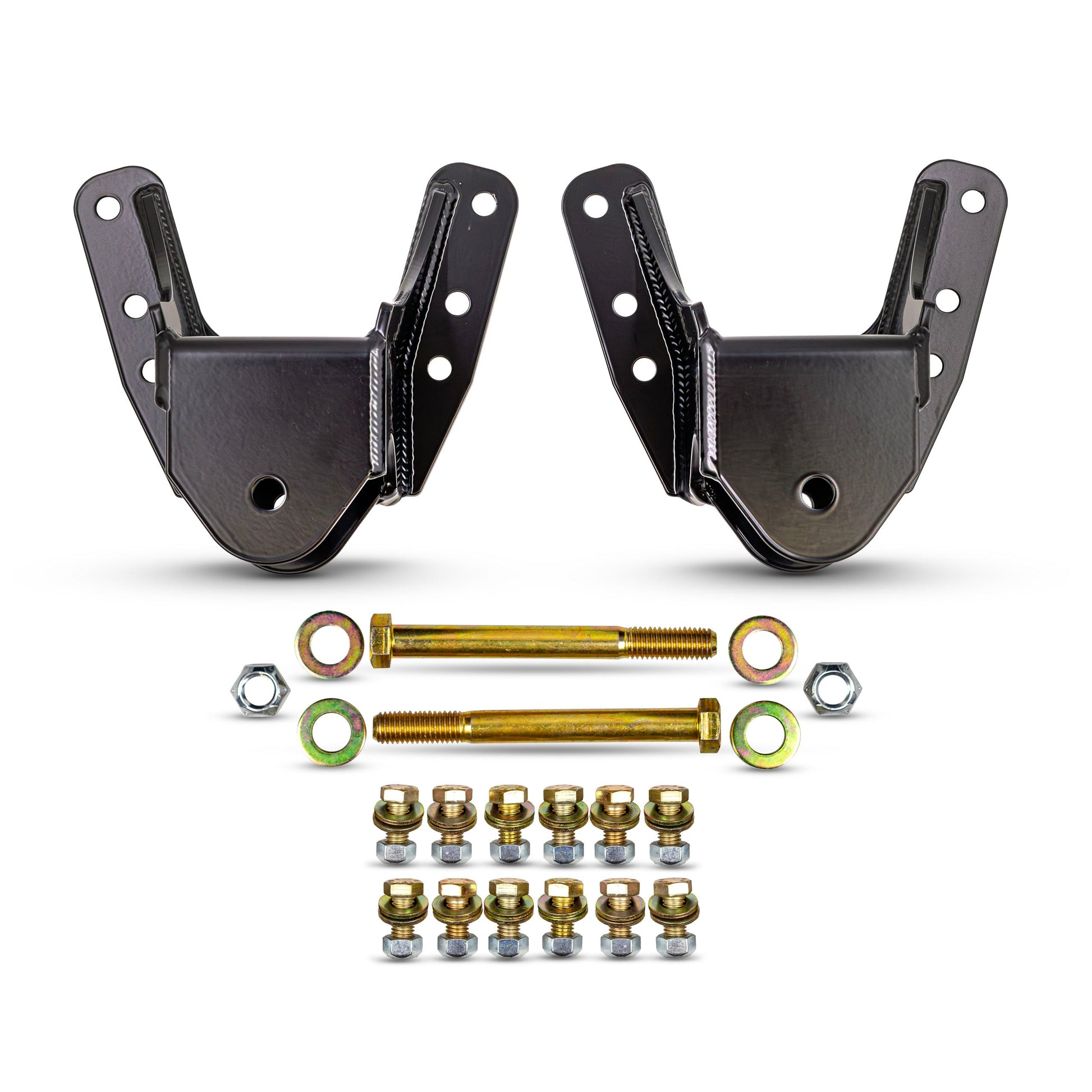 These heavy duty fabricated front leaf spring mount replace weak factory design. They are CAD designed, laser cut and formed from much thicker, stronger material and is an awesome heavy duty upgrade for any F250/350. They are designed to work with Factory or Aftermarket leaf springs and have a 5/8" diameter grade 8 Pivot bolt. Hardware to attach them to the frame is included and they come in a beautiful powder coated semi gloss black finish.